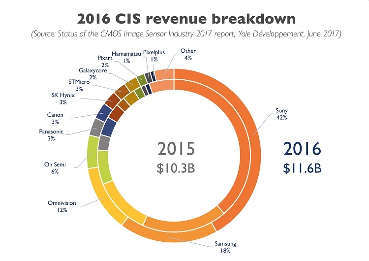 那么,當(dāng)今的CIS產(chǎn)業(yè)現(xiàn)況如何?Sony仍然是無庸置疑的市場(chǎng)領(lǐng)導(dǎo)者,由于穩(wěn)居移動(dòng)市場(chǎng)關(guān)鍵地位而擁有約42%的占有率。其后分別是三星(18%)、OmniVision (12%)、安森美半導(dǎo)體(ON Semiconductor;6%)與Panasonic(3%)。此外,在該報(bào)告中并涵蓋Basler、CMOSIS、Cognex、Fairchild Imaging、FLIR、New Imaging Technologies、odos imaging、Omron、Point Grey、Teledyne e2v、Teledyne DALSA以及Toshiba Teli等其他視覺成像公司。